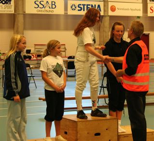 Annika Isaksson, Linköpings FK, på segerpallen flankerad av tvåan Kirsten Höglund, Västerås Fäktklubb, i damseniorernas mästerskap
